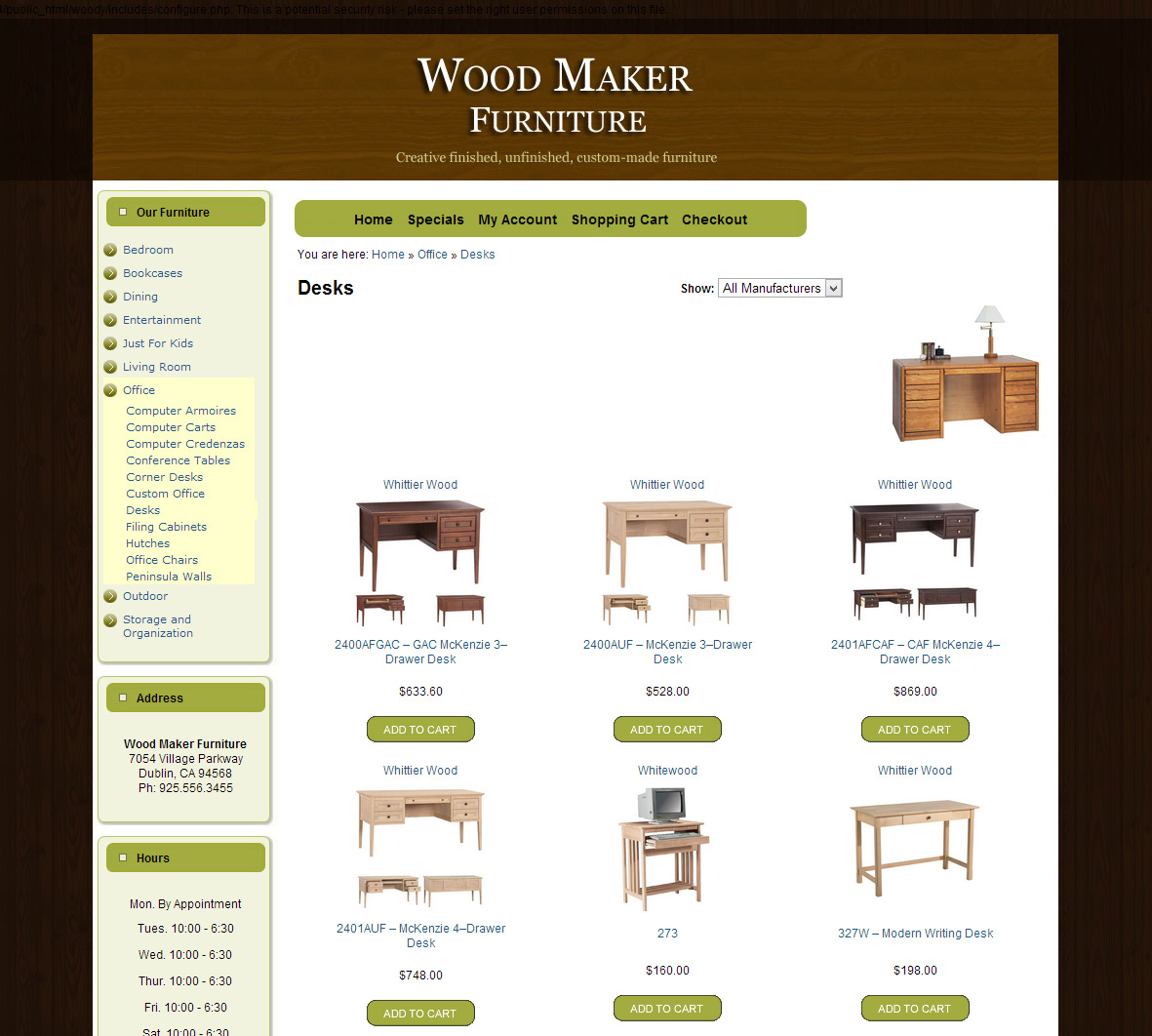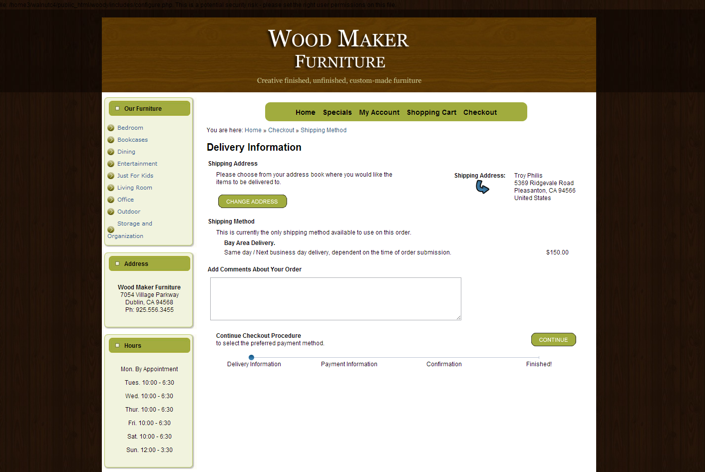 This online furniture store was designed for a brick and mortar business. The checkout process was customized to conform to their existing delivery routes and pricing, based on zip code of customer’s address.